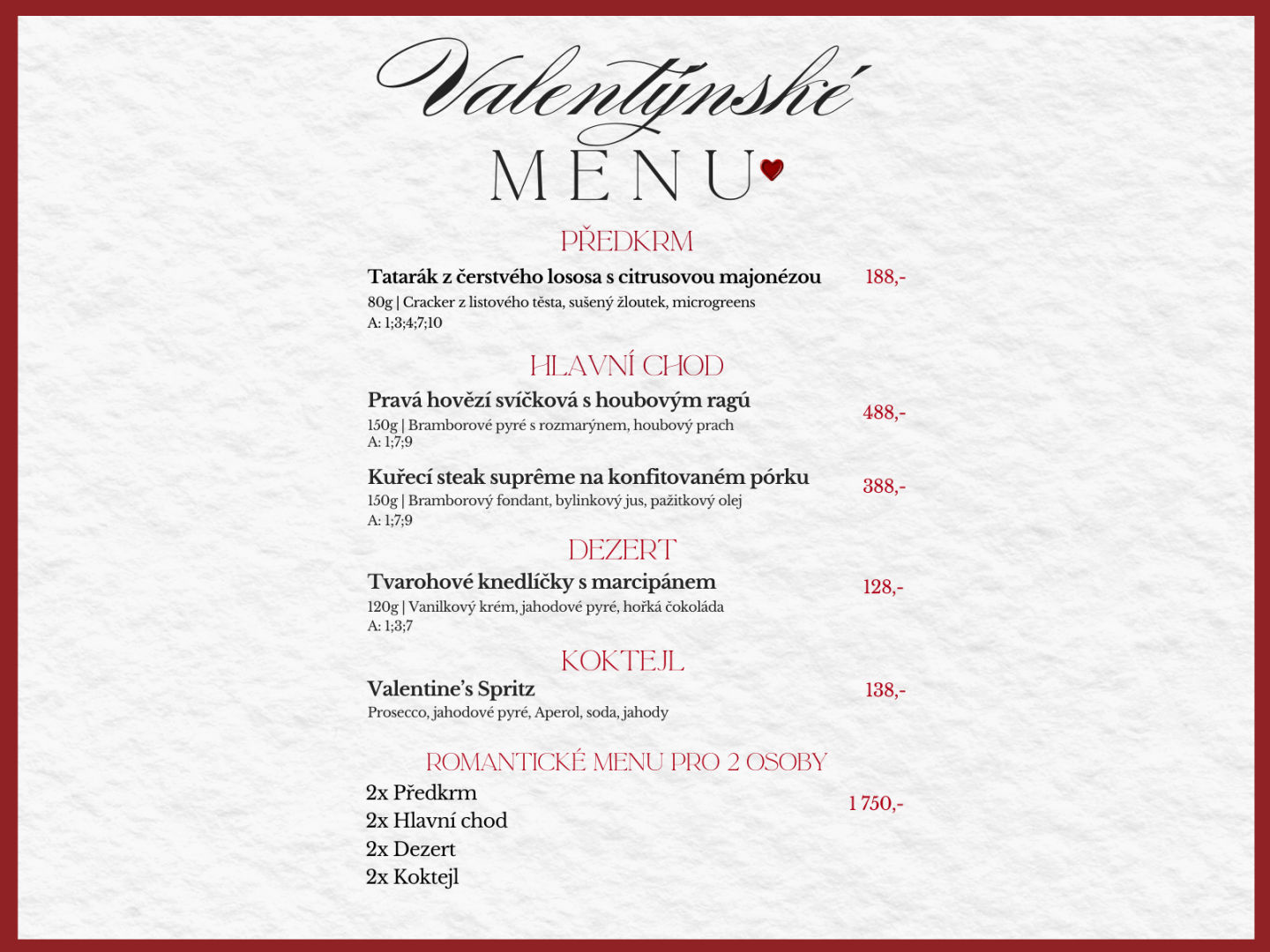 13. a 14. února od 16:00 můžete vzít svou drahou polovičku na večeři, zpomalit a užít si u nás společný čas. Čeká Vás speciální menu plné chutí a romantiky.